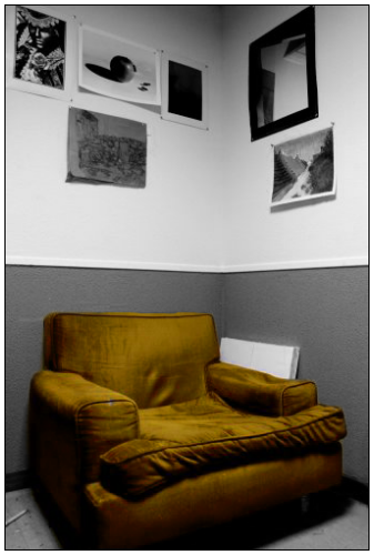 Es un lugar pequeño, sucio, con una pobre iluminación de oficina que se enciende las veces impares. No hay ventilación, sólo una rejilla de la parte superior de la puerta, pero que siempre está tapada por una cartulina negra. Los olores de químicos fuertes, o de tabaco las veces que fumo allí dentro, los camuflo con incienso. Por mucho que barra y friegue, el suelo siempre está sucio, siempre hay polvo de carboncillo y pastel, o telas de araña, polvo del de siempre, pelusas, restos de goma de borrar. Hay fotos colgadas por las paredes, decenas, algunas bonitas y otras horrorosas, todas de diferentes estilos, tamaños diferentes, enmarcados diferentes, de todos los miembros que pasaron por allí.