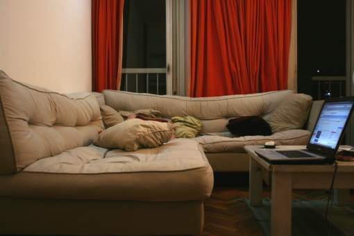Ya hay cosas que podría decir que hago siempre. Las cosas empiezan a tener su función, empiezan a ser irremplazables. El cojín naranja es cómodo para la cabeza, el verdoso es perfecto para ir a dormir, el rojo pequeño es donde apoyo el portátil en momentos como este.