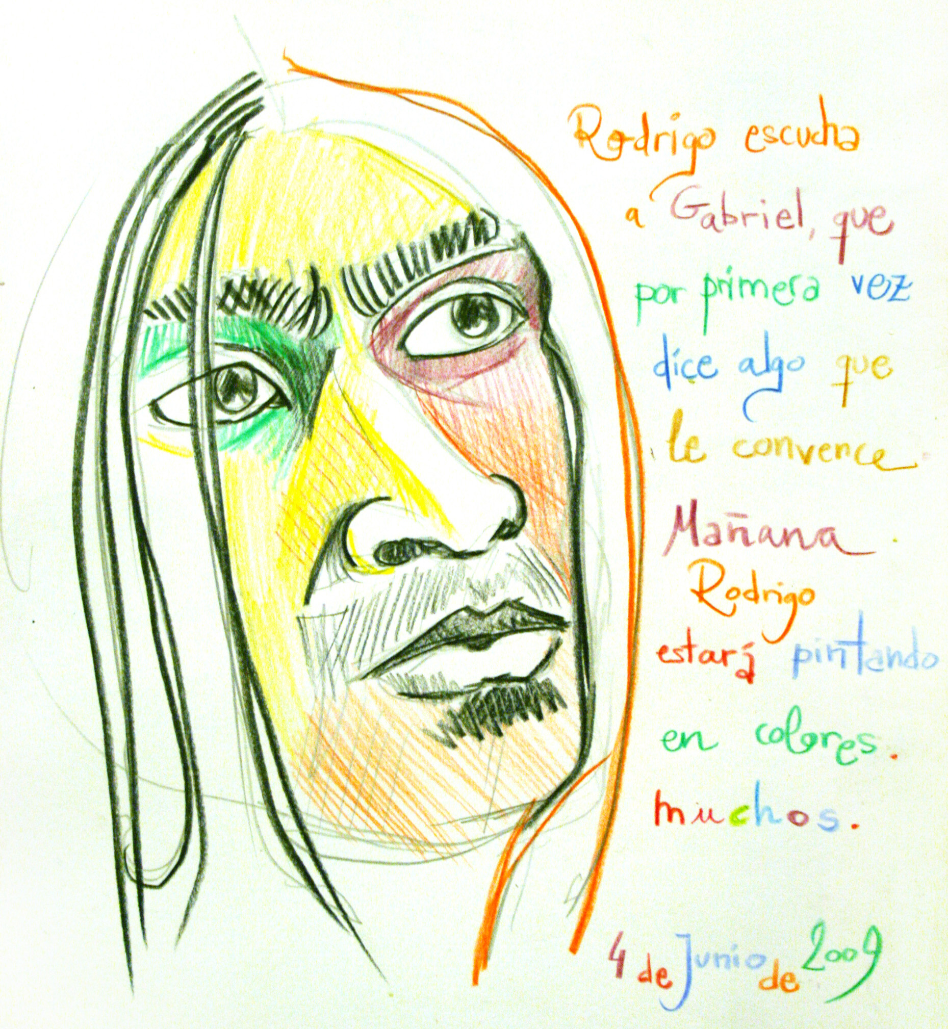 Y Rodrigo quedó parcialmente satisfecho con la explicación. Mientras tanto, yo hice uso de mis lápices de colores para retratarle.